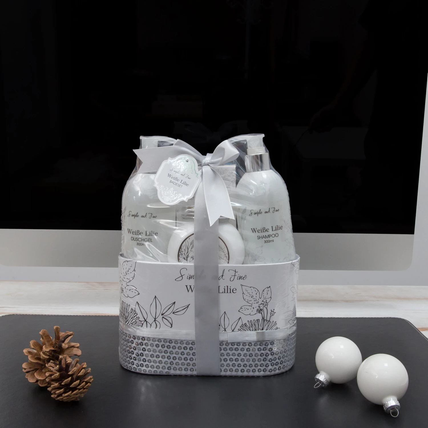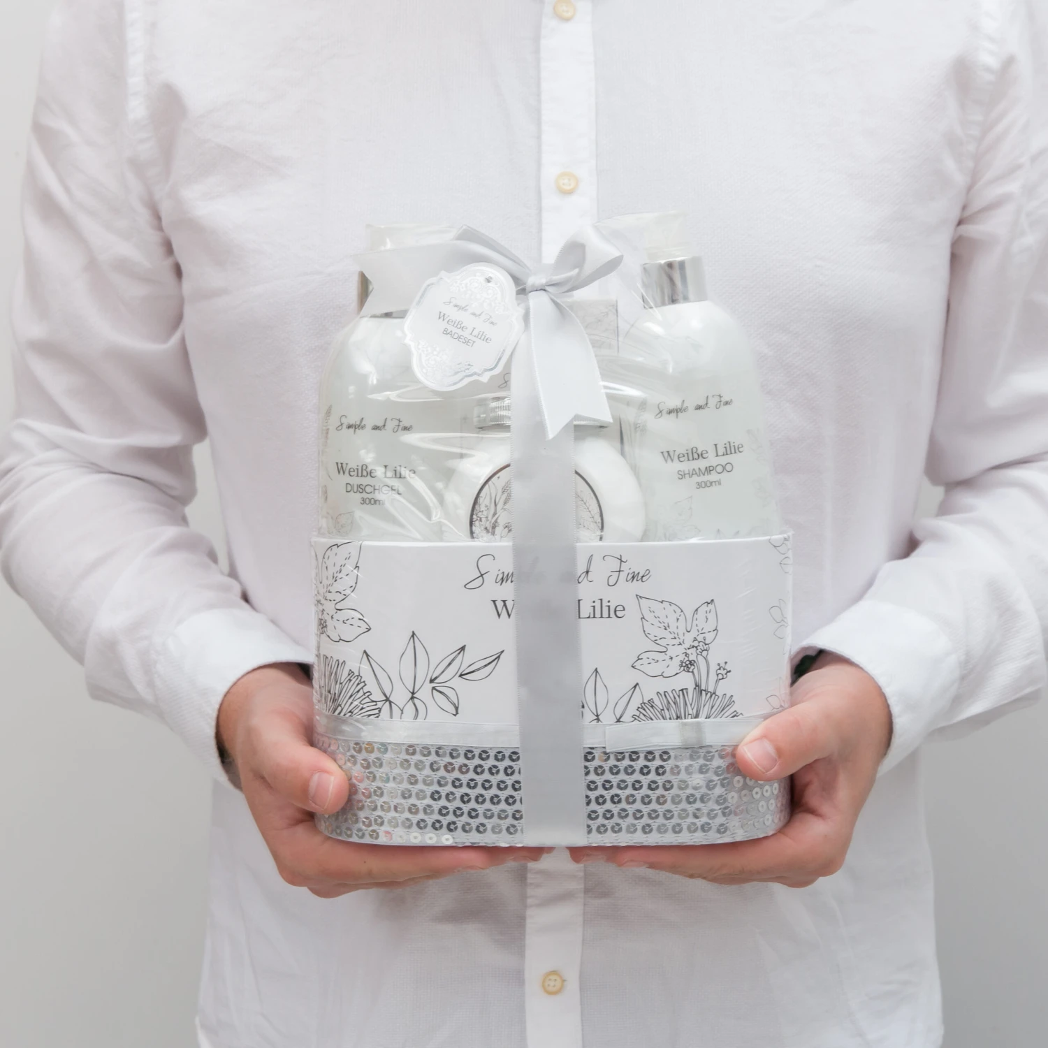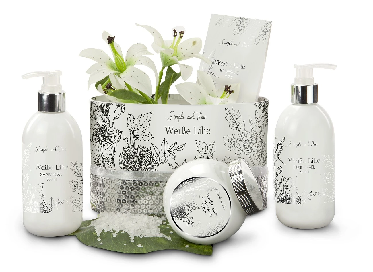 Schon in der Antike war die weiße Lilie ein Symbol der Schönheit und Reinheit. Für Reinheit sorgt unser Wellness-Set mit 100 g Badesalz, 300 ml Duschgel und 300 ml Shampoo, die 250 ml Bodylotion pflegen Ihren Körper sanft. Der edle Geschenkkarton ist mit Palietten verziert und vermittelt einen Hauch von Luxus – auch im Badezimmer!