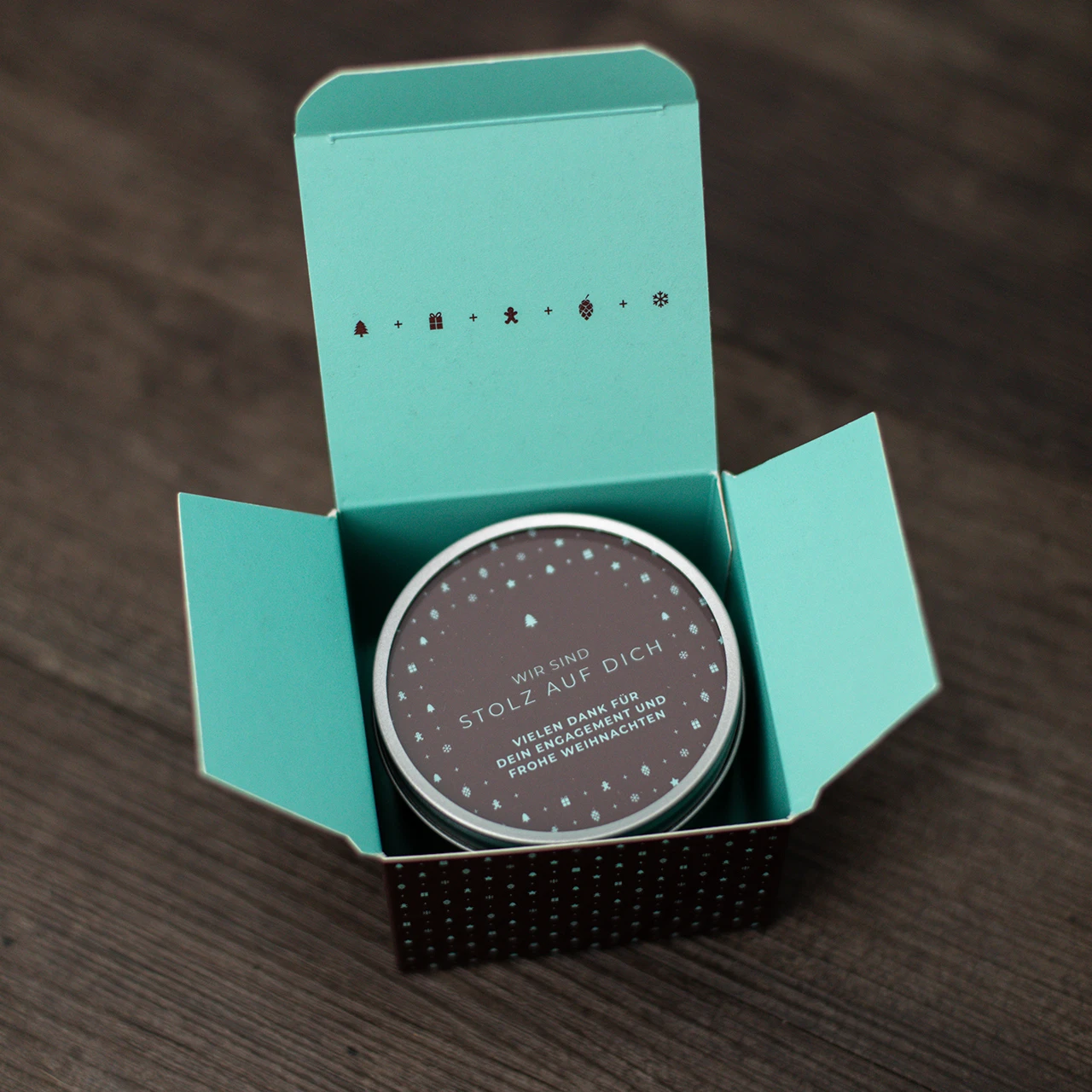 - Aufdruck: „Wir sind stolz auf Dich – Vielen Dank für Dein Engagement und frohe Weihnachten“