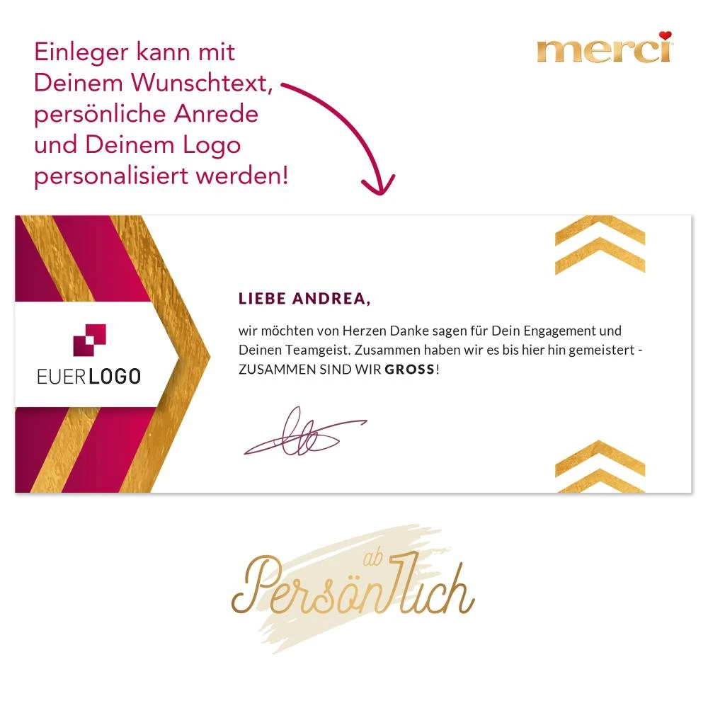 In der originellen Verpackung zum Aufklappen versteckt sich passend zum Anlass eine große Schokoladentafel „merci“. Und wenn Du Dein Dankeschön richtig persönlich machen möchtest, drucken wir Euren individuellen Wunschtext mit persönlicher Anrede jedes einzelnen Beschenkten auf eine hochwertige Einlegekarte. Wertschätzung, Anerkennung und Dankbarkeit – einfach GROSS!